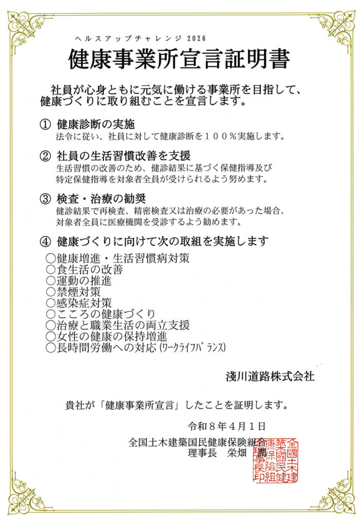 「ヘルスアップチャレンジ2026」に取り組みます。 2026年4月1日2026年4月24日 当社は、令和8年4月1日付で、全国土木建築国民健康保険組合が実施する「ヘルスアップチャレンジ2026」への取り組みを、昨年に引き続き宣言いたしました。今年度も、睡眠やストレス、生活習慣の改善に関する健康セミナーの開催をはじめ、健康診断の受診徹底および再検査・精密検査の受診勧奨など、具体的な取り組みを通じて、従業員の健康保持・増進に努めてまいります。